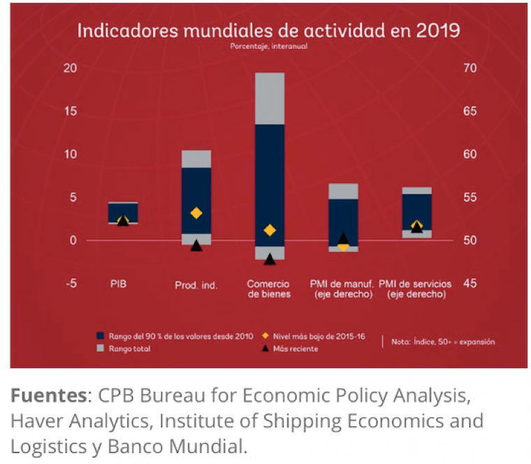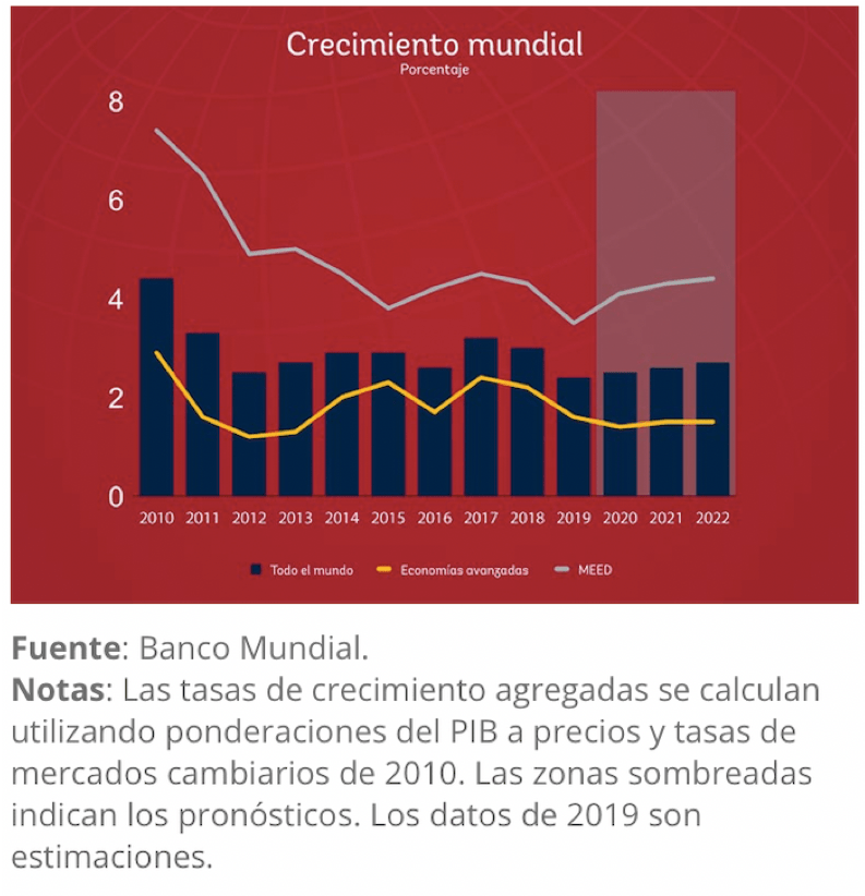 De acuerdo con el informe semestral de Perspectivas económicas mundiales del Banco Mundial; para 2020 el crecimiento económico alrededor del planeta oscilará en apenas 2.5%, siendo solamente 0.1p.p. mayor al crecimiento registrado en 2019 (2.4%); cabe mencionar que el pasado año fue uno de incertidumbre económica debido a las tensiones políticas y comerciales entres dos potencias como China y Estados Unidos, aunado a la volatilidad presentada en el precio del petróleo y combustibles.