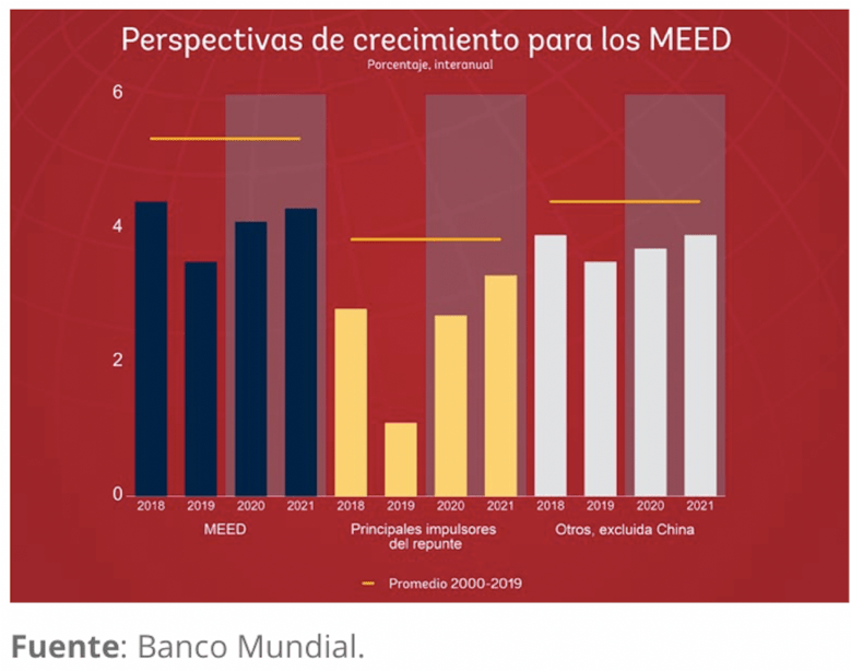 En 2020 se proyecta un crecimiento de 2.5% a nivel mundial, sin embargo las economías avanzadas (como Estados Unidos) disminuirán su ritmo en al menos 1.4%. Siendo entonces los principales impulsadores del leve repunte en el crecimiento económico mundial los Mercados emergentes y Economías en desarrollo, quienes se prevé alcancen un ritmo de 4.1% para este año, un cambio considerable dado que es rutinario que sean las economías avanzadas quienes lleven al alza el crecimiento y estabilidad económica del mundo.