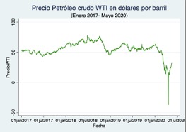 Debido a los choques de oferta y demanda presentados como consecuencia de la pandemia mundial, el precio de diferentes bienes y servicios han ido a la baja. El más reciente ha sido el precio del petróleo. El pasado 20 de abril el precio del petróleo ha sido cotizado a precios negativos, esto en referencia al valor del WTI Crude Oil (INFOBAE, 2020). Dicho de forma simple, los productores y comerciantes de petróleo preferían negociar a precios de venta negativos en lugar de incurrir en mayores costos de almacenamiento del mismo. En la siguiente gráfica se puede observar el comportamiento en la variación en los precios del petróleo WTI, que es la corriente de crudo que utiliza como punto de referencia del precio del petróleo gran parte de América.